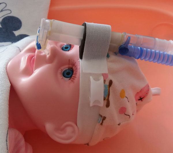 上圖:固定斯蒂芬呼吸管路的嬰兒帽